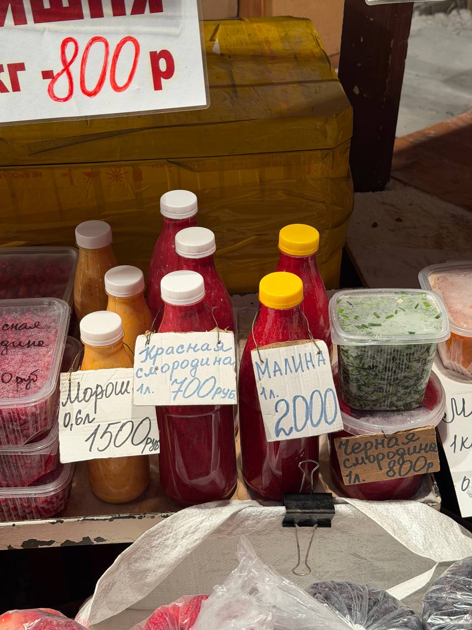 Ягоды. У многих к весне заканчиваются запасы варенья, поэтому идем на рынок за готовым. Литровое варенье из красной смородины - 700 рублей, из малины - 2000. 600 граммов варенья из морошки - 1,6 рублей.