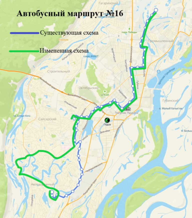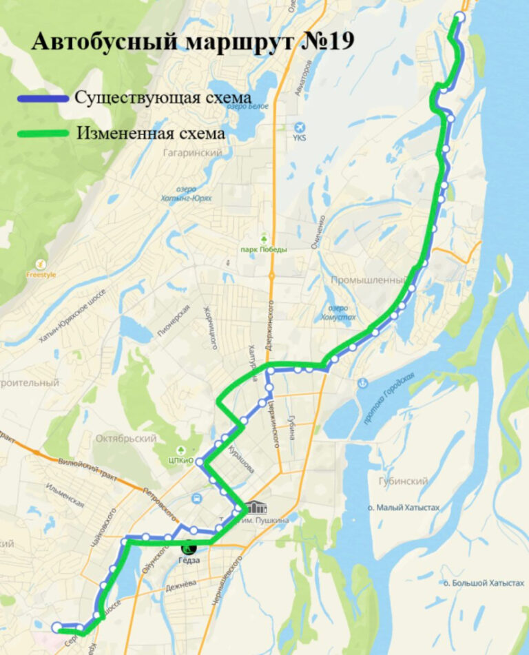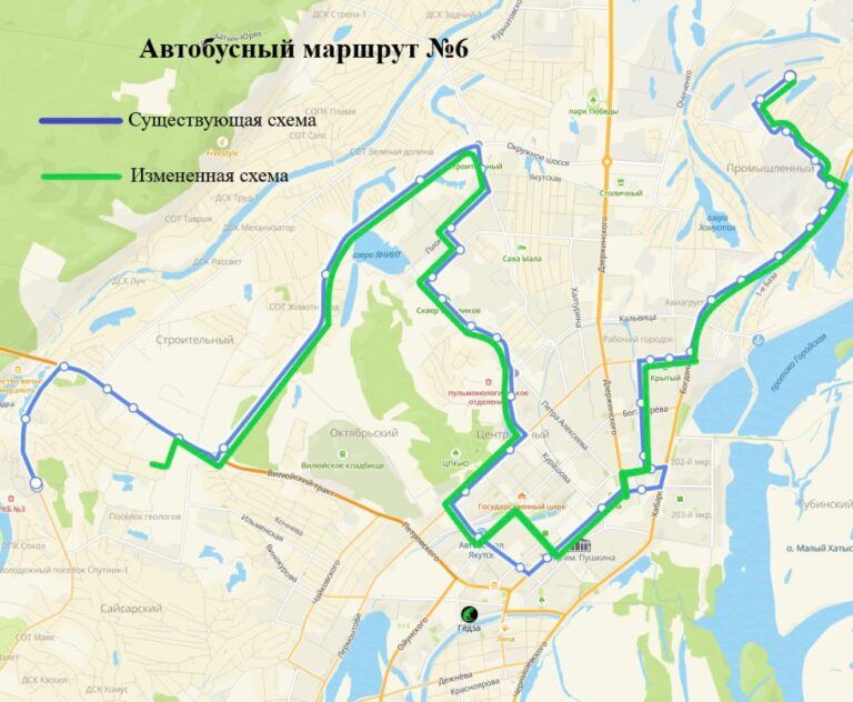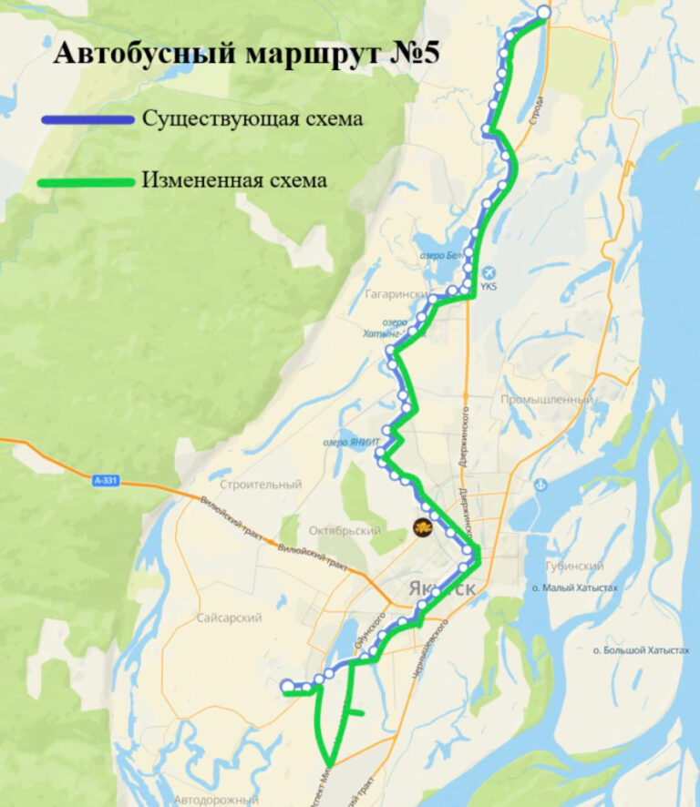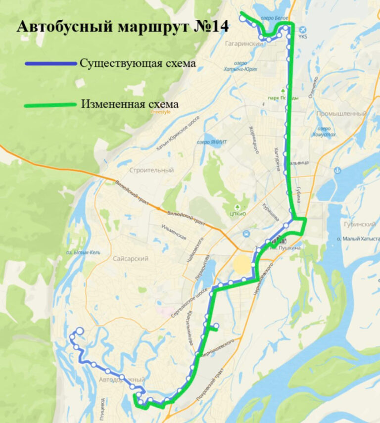 Предлагаемая схема движения: с конечной остановки «Птицефабрика» по Сергеляхскому шоссе — Вилюйскому тракту — Петровского — проспекту Ленина — Хабарова — Богдана Чижика — Федора Попова — Лермонтова — Сергеляхскому шоссе — Студенческая — до конечной остановки «Птицефабрика».