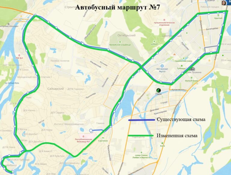 Предлагаемая схема движения: с конечной остановки «Три сосны» по Вилюйскому тракту — Объездному шоссе — улицам Жорницкого — Пионерская — Космонавтов — Семена Данилова — Петра Алексеева — Стадухина — Лермонтова — Октябрьская — Пояркова — Кирова — проспекту Ленина — Чиряева — Губина — Федора Попова — Богдана Чижика — 50 лет Советской Армии — Бабушкина — до конечной остановки «Челюскина».