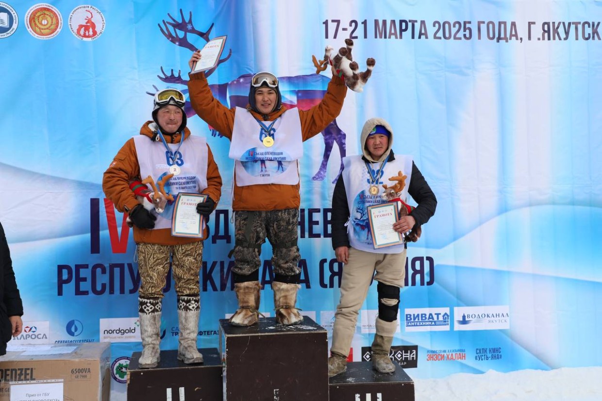 В гонках на оленьих упряжках среди мужчин на дистанции 5 км лучшими стали Павел Константинов из Эвено-Бытантайского улуса, Юрий Семенов из Нерюнгринского района, Владимир Соловьев из Момского улуса.