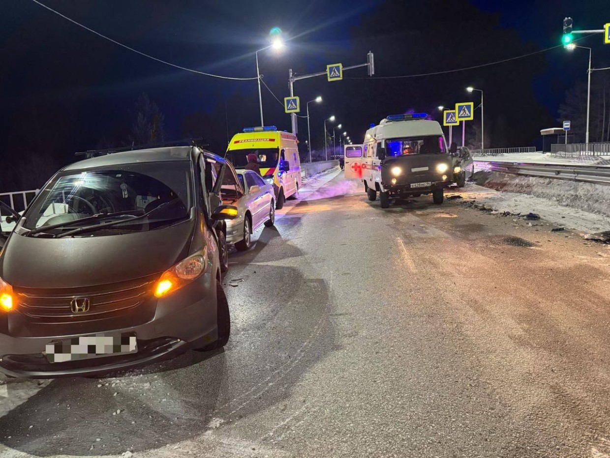 Затем в тот же день, примерно в 20:46 часов вечера, на 10 км. РАД «Умнас» произошло столкновение трех автомобилей. По предварительным данным, 32-летний водитель автомобиля «Honda Freed»следуя по крайней левой полосе со стороны г. Якутска, совершая маневр разворота на регулируемом пешеходном переходе, не предоставил преимущественное право проезда автомобилю «Toyota Opa», который двигался по крайней левой полосе движения. От удара по инерции первый автомобиль отбросило на крайнюю правую полосу, по которой двигался автомобиль «Toyota Mark II». В результате автоаварии пострадали водитель «Honda Freed» и его пассажир, а также водитель «Toyota Opa».