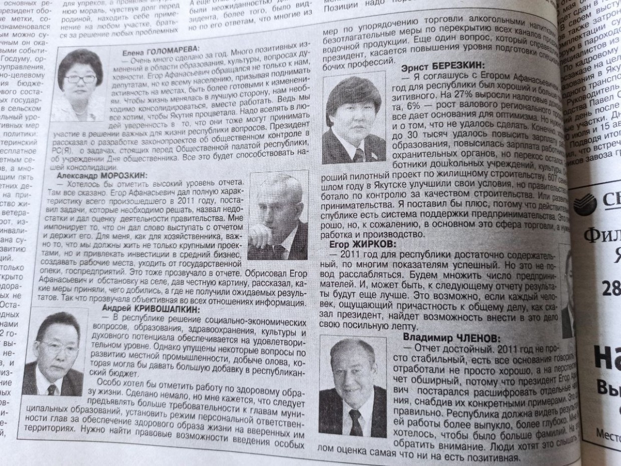 Второй газетный материал посвящен заседанию Общественной палаты Якутии, участники которого обсудили вопросы современного устройства государства. На нем выступили доктор философских наук Виктор Михайлов, депутат Верховного совета РСФСР 5 созыва Зоя Корнилова, судья Конституционного суда Якутии Валерий Прокопьев.