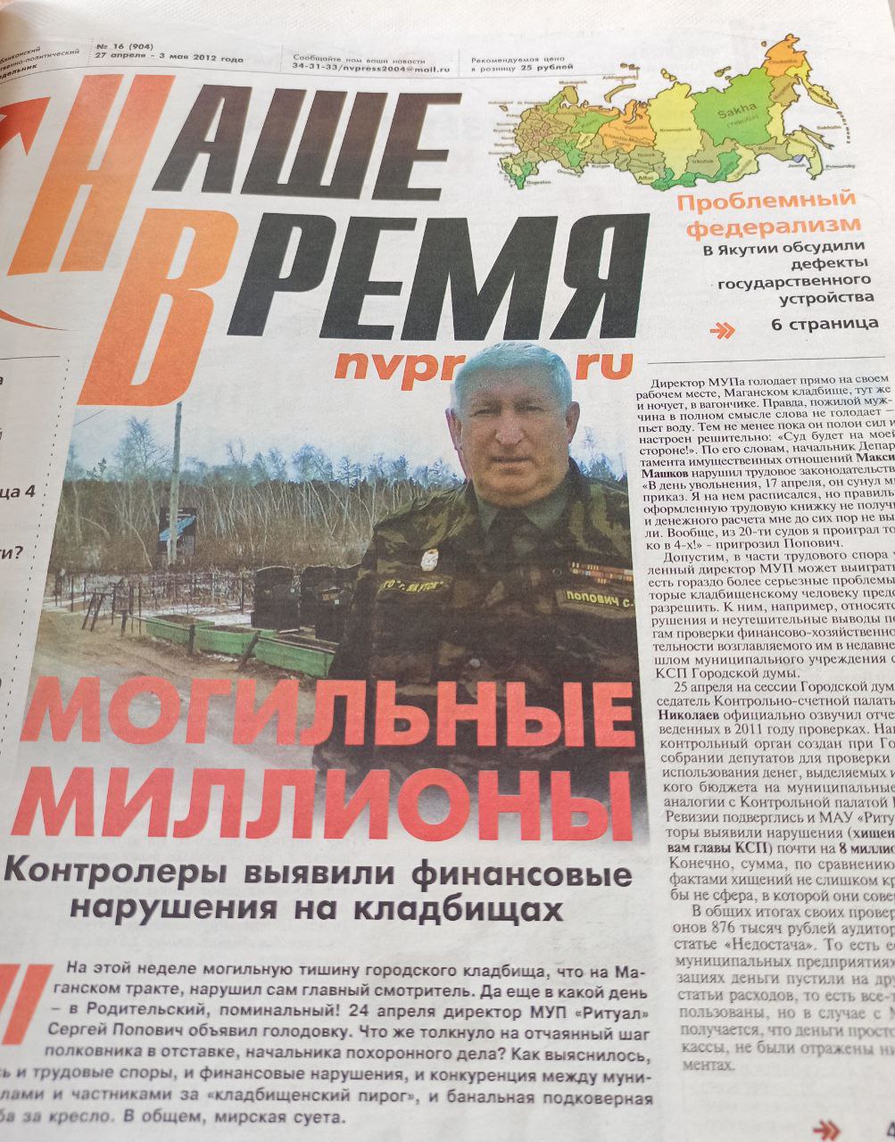И «НВ», и «ЯВ» написали о голодовке, которую на рабочем месте, на Маганском кладбище, объявил директор МУП «Ритуал» Сергей Попович. Поводом стало расторжение трудового договора после аудиторской проверки, обнаружившей недостачу в 7,8 млн рублей.