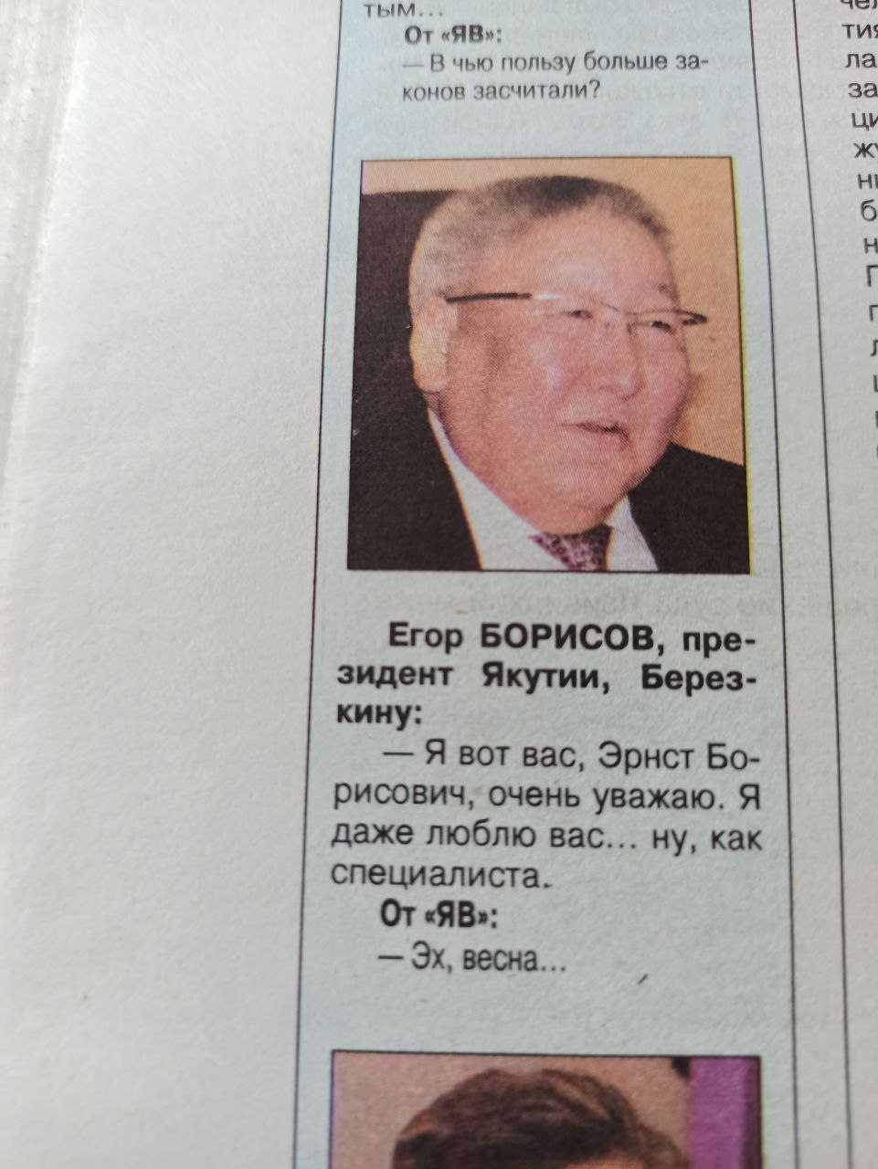 27 апреля Якутия отмечает 30 лет основания Конституции РС(Я) и 100-летие Якутской АССР. Sakhaday стало интересно, как 10 лет назад эта дата была преподнесена в популярных газетах. Отметим, что первую страницу Дню республики посвятила только «Якутия». Еженедельники «Наше время» и «Якутск вечерний» на обложке поместили информацию о голодовке директора МУП «Ритуал» Сергея Поповича и участии школьника Алексея Челбердирова в экспедиции на Северный полюс. Общей темой для двух конкурирующих газет стала сессия Якутской гордумы, на которой группа депутатов внесла вопрос о досрочной отставке вице-спикера Павла Петрова. Спойлер: Петров остался при должности, но стал основным героем постоянной «нашевременской» рубрики «ИТАР Хатасс».