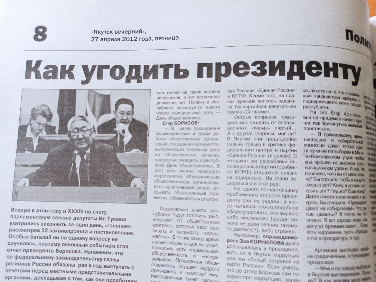«Якутия» не стала писать репортаж с сессии гордумы. Зато посвятила несколько материалов к Дню республики. Первую страницу праздничного выпуска украсила фотография семьи, получающей новую квартиру в селе Намцы. Со второй страницы читателей газеты поздравили с 27 апреля глава республики Егор Борисов, экс-президент Вячеслав Штыров, спикер Ил Тумэна Виталий Басыгысов и гендиректор «Сургутнефтегаза» Владимир Богданов.