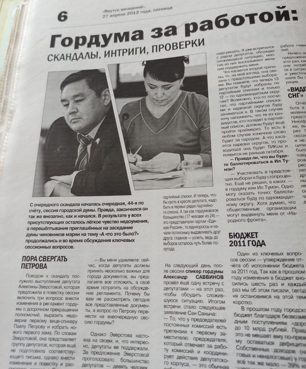 Не менее интересно, судя по публикациям, события развивались на сессии Якутской городской думы, когда группа депутатов попыталась объявить импичмент заместителю председателя. Произошло это неожиданно, с подачи Алевтины Эверстовой, попросившей включить в повестку вопрос о досрочной отставке Павла Петрова.