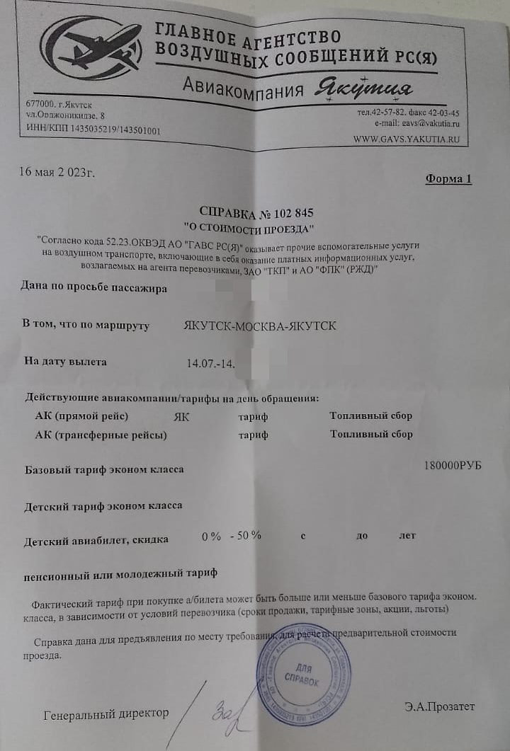 Людмила (прим. ред. имя изменено) работает в бюджетном учреждении, которое должно возместить ей расходы на проезд. Чтобы добраться до заветного курорта, в первую очередь, ей нужно купить билеты Якутск – Москва – Якутск. Она приобрела в Главном агенстве воздушных сообщений Якутии справку «О стоимости проезда» авиакомпании «Якутия». Цена туда-обратно 180 тысяч рублей шокировала нашу читательницу.