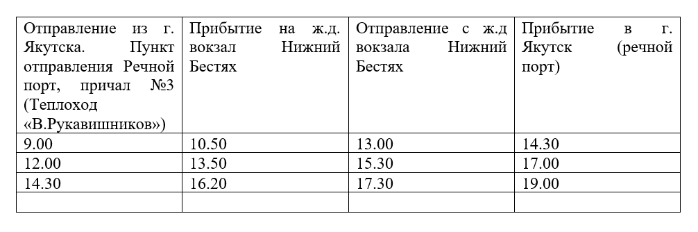 Из города Якутска отправление с причала №3 речного порта Якутск на теплоходе «В. Рукавишников», с причала п. Нижний Бестях – на автобусах АО «АК «ЖДЯ».