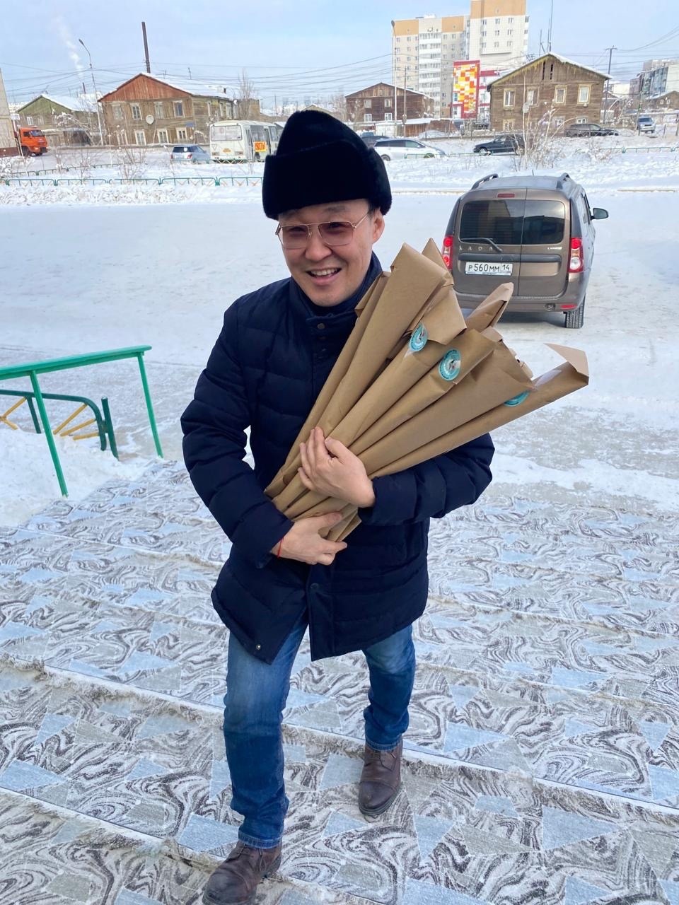 Аммосов вышел в народ, чтобы подарить работающим в магазинах женщинам по тщательно упакованному тюльпану.