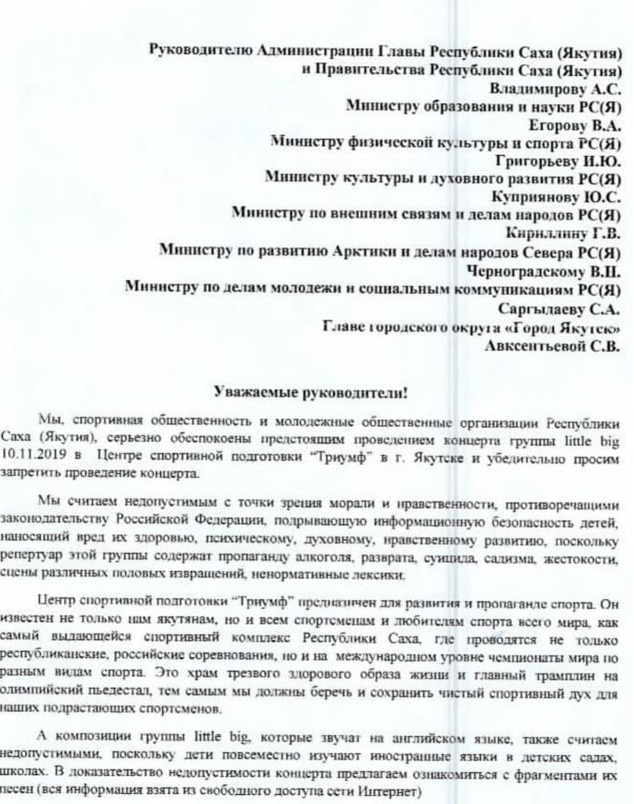 "Мы, спортивная общественность и молодежные общественные организации Якутии, серьезно обеспокоены предстоящем проведением концерта группы little big в ЦСП “Триумф” г. Якутск, считаем недопустимым с точки зрения морали и нравственности, противоречащими законодательству, подрывающую информационную безопасность детей, наносящий вред их здоровью, психическому, духовному, нравственному развитию, поскольку репертуар этой группы содержат пропаганду алкоголя, разврата, садизма, сцены различных половых извращений, ненормативные лексики", - сообщается в обращении.