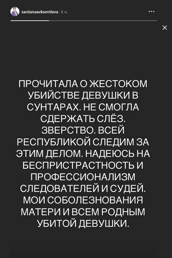 Также на трагедию отреагировала Сардана Авксентьева. "Не могла сдержать слез. Зверство. Всей республикой следим за этим делом", - написала она в сторис.