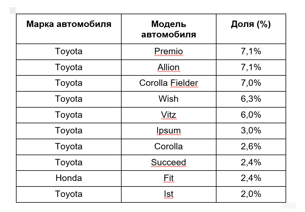 Якутск — единственный город в аналитике, где отечественный автопром практически отсутствует (0,3%). Рынок полностью захвачен японскими брендами: девять из десяти позиций в топе занимают модели Toyota. Лидерами стали Toyota Premio и Toyota Allion с долей 7,1% каждая.