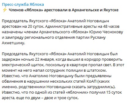 Информация о задержании Анатолия Ноговицына появилась в Телеграм-канале пресс-службы Яблоко еще 23 января. В Якутске никто из соратников не знал о его аресте, хотя и предполагали.