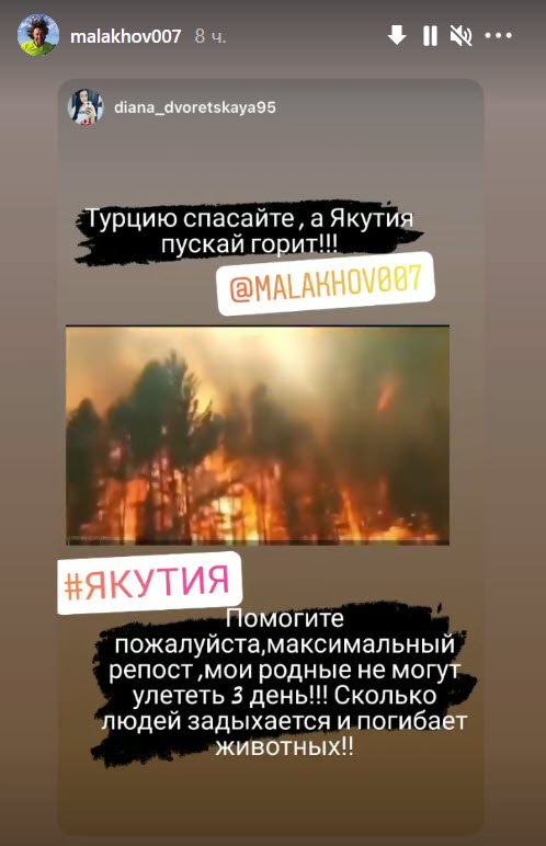 Андрей Малахов репостнул сторис о пожарах в Якутии