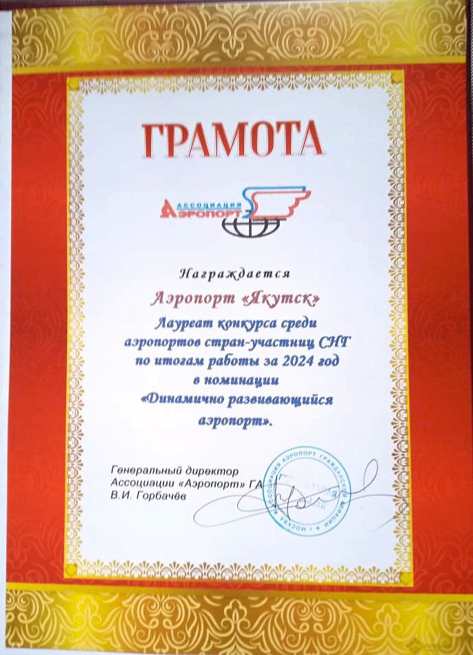 29 мая 2025 года Ассоциация «Аэропорт» гражданской авиации подвела итоги ежегодного конкурса «Лучший аэропорт стран-участниц СНГ». В числе победителей оказалась главная воздушная гавань Республики Саха (Якутия) — аэропорт Якутск, который получил почетное звание в номинации «Динамично развивающийся аэропорт» по итогам работы за 2024 год.