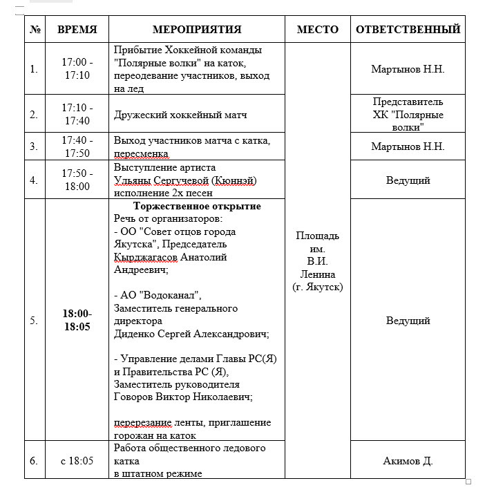 Мероприятия, посвященные торжественному открытию катка, начнутся 11 февраля в 17:00 с дружеского матча хоккейной лиги Якутска (Программа в приложении №1).