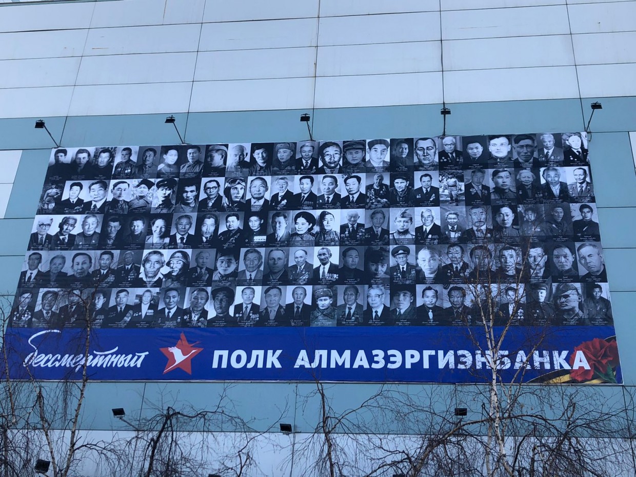 АЭБ разместил большой баннер «Бессмертный полк Алмазэргиэнбанка» на здании своего головного офиса в Якутске по обслуживанию юрлиц на проспекте Ленина, 1.