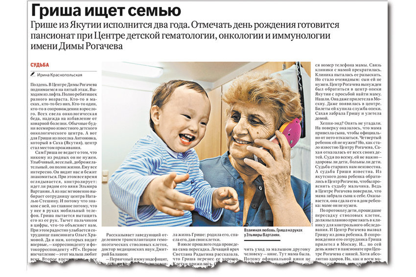 В номере "РГ - Неделя" от 23 октября 2019 года опубликована моя заметка под названием "Гриша ищет семью". Я рассказала о пациенте Центра имени Димы Рогачева, мальчике из Якутии, который лечился здесь от тяжелейшего первичного иммунодефицита. Рассказала о его страшной семейной трагедии: тяжелобольного ребенка с особой жестокостью бросила родная мама. И Гриша, которого успешно вылечили, который теперь абсолютно здоров, оказался вынужденным жителем Рогачевского центра.