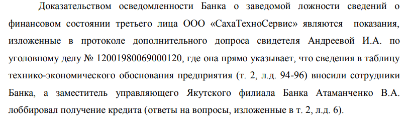 Она же пояснила, что сотрудники банка сами помогали с оформлением ложных документов. Этими людьми, по ее словам, были заместитель управляющего Якутского филиала «Россельхозбанка» Владимир Атаманченко и управляющий банка, имя которого не приводится полностью в судебном акте.