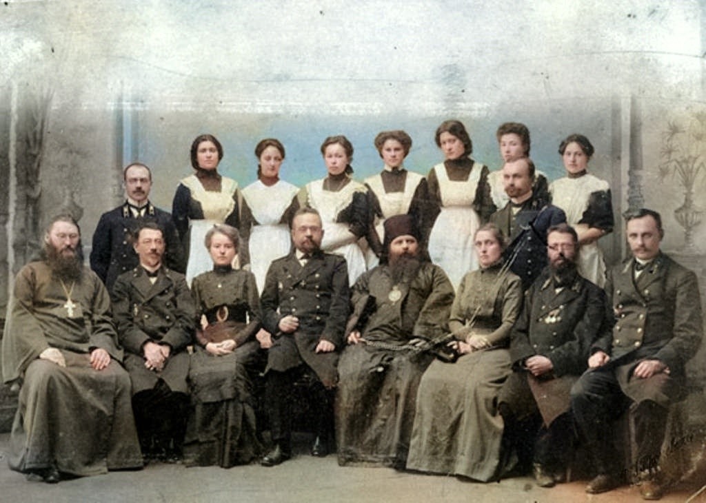 Выпускницы Якутской женской гимназии, окончившие курс 7-го класса в 1911 году, со священником Петром Суворовым (сидит первый слева), губернатором Якутской области Иваном Ивановичем Крафтом (четвертый слева), преосвященным Иннокентием, епископом Якутским и Вилюйским (пятый слева) и начальницей гимназии Елизаветой Николаевной Кузнецовой (шестая слева).