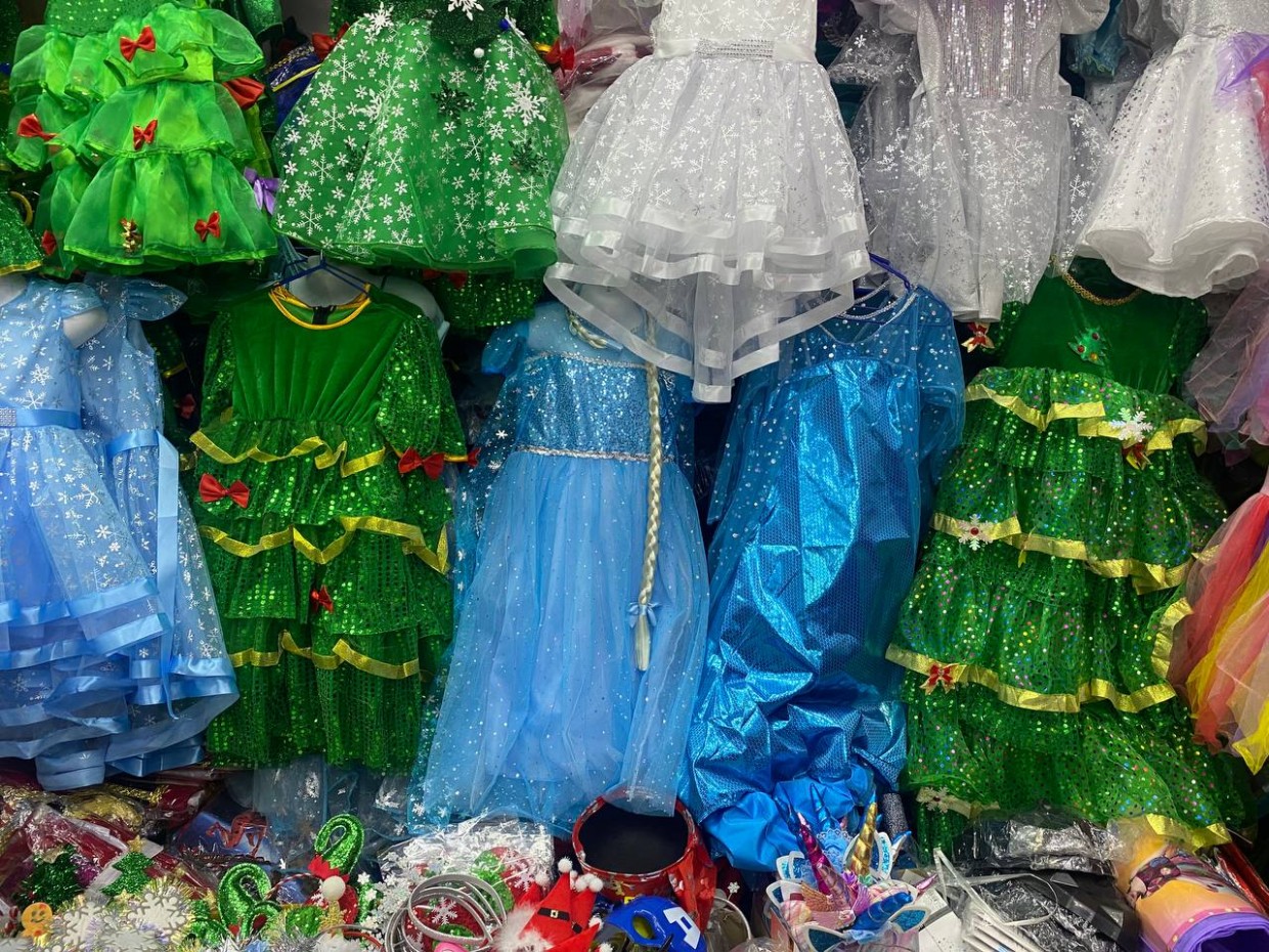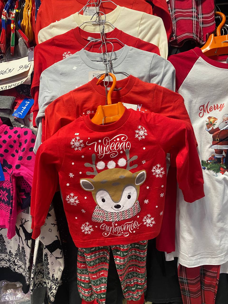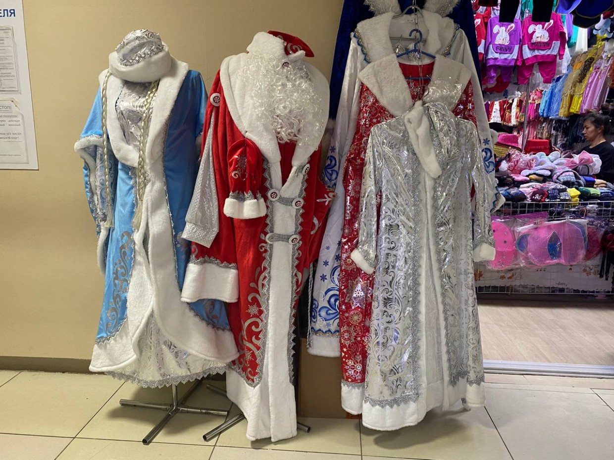 Новогодние свитера с оленями по 900-1000 рублей, пижамы по 1300-1500 рублей, детские пижамы 1200 рублей. Костюмы Деда Мороза и Снегурочки от 3500 рублей, самые дорогие на манекенах по 10 000 рублей.
