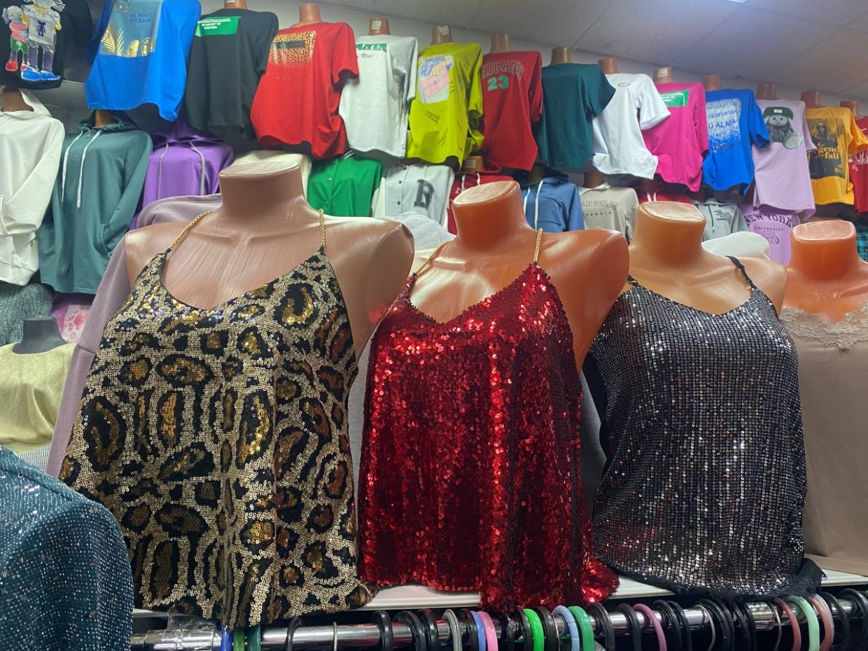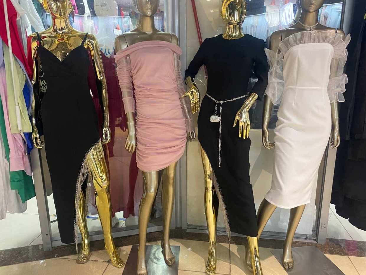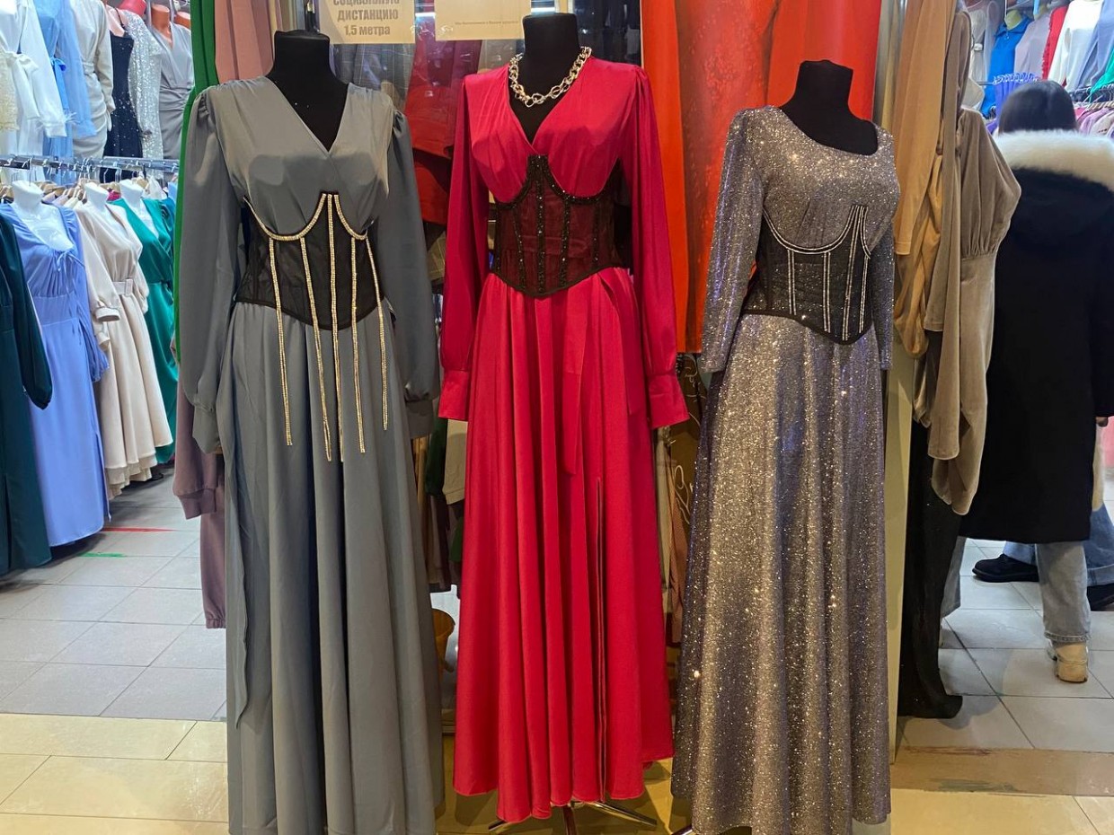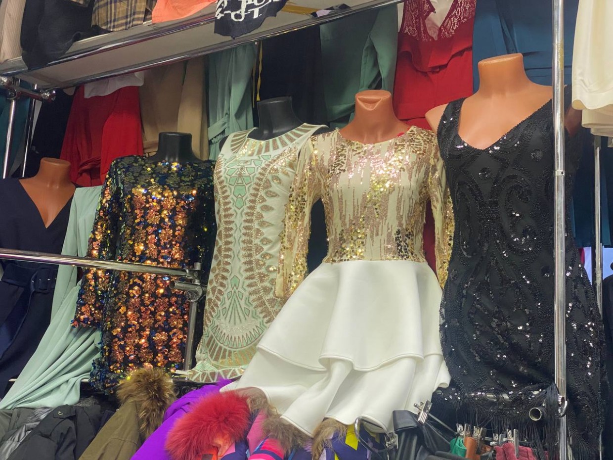 Женские вечерние платья стоят 3000-3500, корсеты по 2500 рублей. Выбор огромный. Больше всего развеселил леопардовый топ «богини дискотеки»!