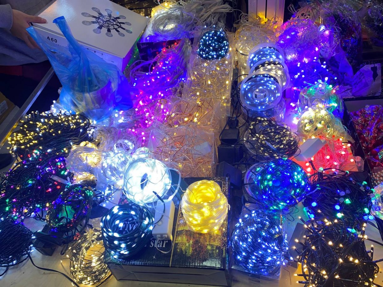Гирлянды стоят 1800 рублей за 100 метров. Есть множество елочных игрушек, свеч и фонарей.