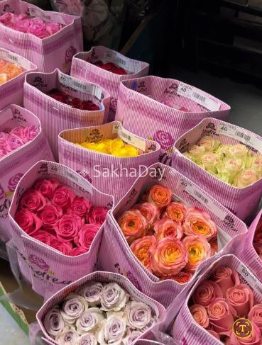 Цветы приезжают плотно упакованные в картонные коробки, их сразу разгружают пачками с этикетками.