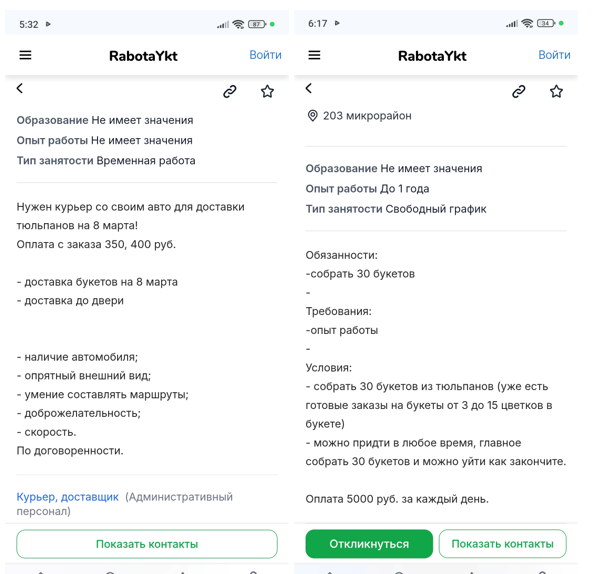 Предложения о временной работе в цветочных салонах начали мелькать еще с конца февраля. Так, опытным флористам предлагалась однодневная зарплата в 5 тысяч рублей, а водителям-курьерам — от 350 рублей за доставку.