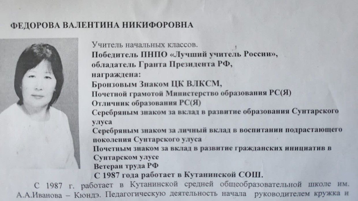 Отметим, что Валентина Никифоровна была отличником образования РС (Я), обладателем серебряного знака за вклад в развитие Сунтарского улуса, серебряного знака за вклад в воспитании подрастающего поколения Сунтарского улуса, почетного знака за вклад в развитие гражданских инициатив в Сунтарском улусе.