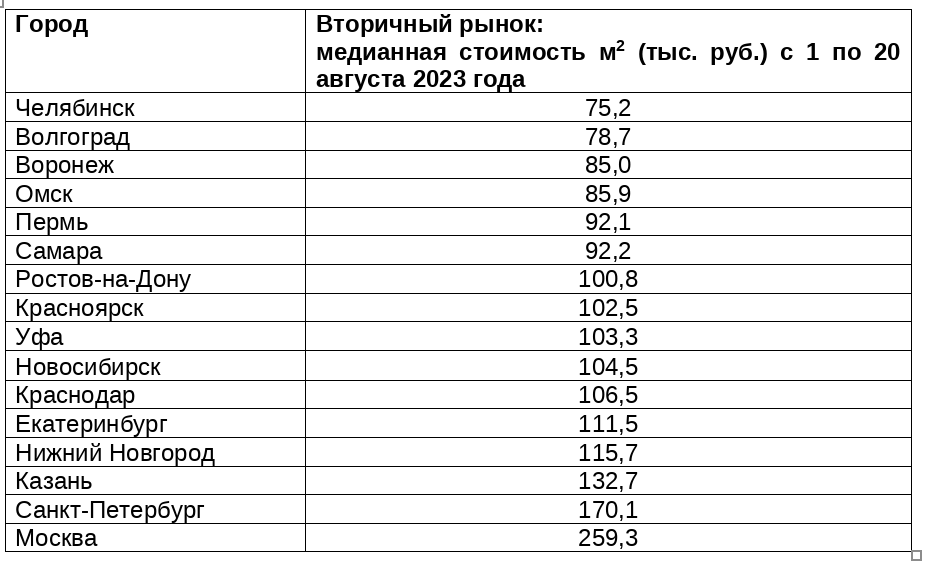 Цены на вторичное жильё в российских городах-миллионниках, с 1 по 20 августа 2023 г.