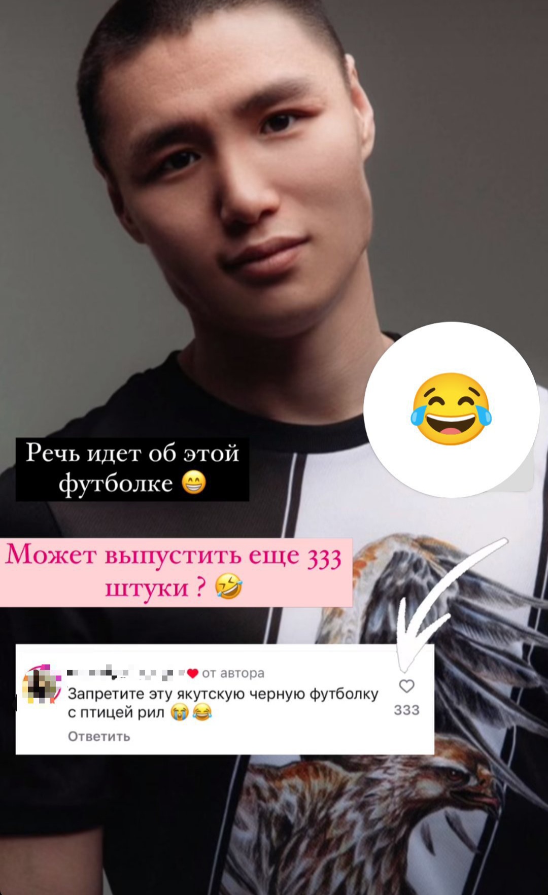 Жительница Якутска Алена М., в своем ролике говорит, почему мужчины приходят «охотиться» в ночных клубах, одетые как бомжи. Она приводит в пример, что один мужчина был в футболке TANAS с орлом и красной олимпийке.