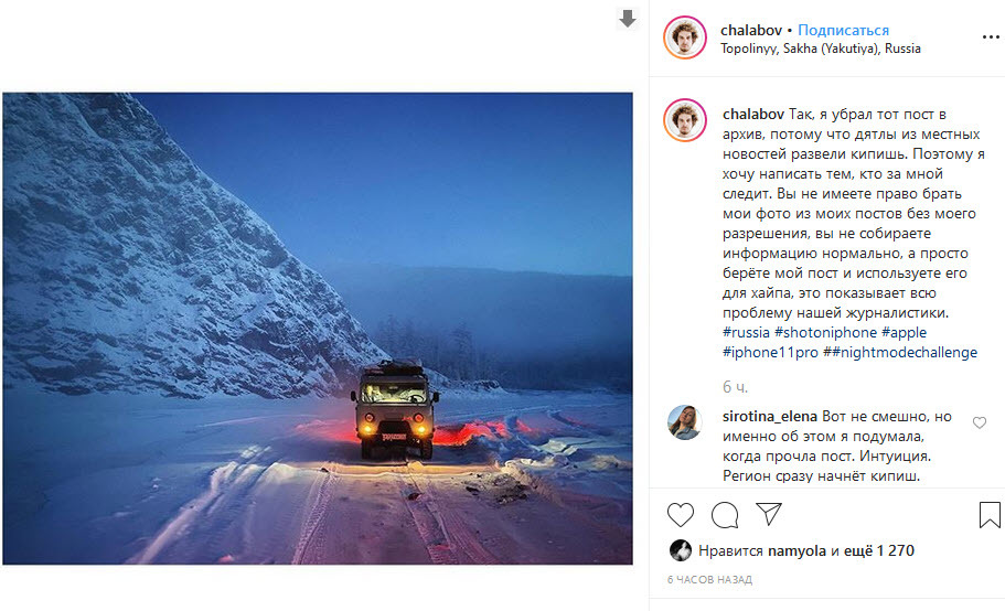 "Так, я убрал тот пост в архив, потому что дятлы из местных новостей развели кипишь. Поэтому я хочу написать тем, кто за мной следит. Вы не имеете права брать мои фото из моих постов без моего разрешения, вы не собираете информацию нормально, а просто берёте мой пост и используете его для хайпа, это показывает всю проблему нашей журналистики".