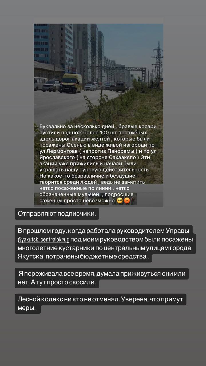 Несмотря на то, что Дина Николаева обосновалась в Северном Кипре, она зорко следит за якутскими новостями. Недавно подписчики ей сообщили об уничтожении деревьев и кустарников в столице. Sakhaday писал об этом вопиющем факте.