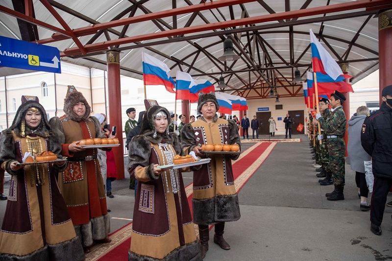 Пассажиров поезда и гостей мероприятия встретили по якутскому обычаю оладьями и напитком «Бырпаах», торжественным митингом и музыкальным поздравлением. Железнодорожники раздали присутствующим георгиевские ленточки и праздничные флажки.