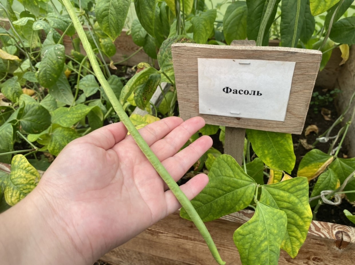 Матрена Афанасьевна посадила семена гороха в открытый грант 15 мая. Растению нужна опора, чтобы стебли не валялись на земле. Воспитанники лагеря любят лакомиться свежим горошком. И нам тоже дали его попробовать, на вкус он непривычно сладкий, ягодный, в отличие от консервированного, который мы привыкли добавлять в оливье.