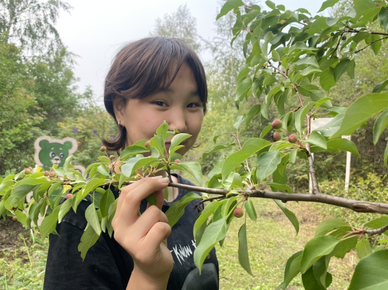 Напоследок поделимся фотографией сибирской яблони, которую показала нам воспитанница лагеря и экскурсовод Айылҕаана Унарова. Малюсенькие яблочки были на вкус кислые, это зеленые сорта. Помимо яблонь в «Юном исследователе» растут акации, бальзамин, тысячелистники, лилии и другие диковинные кустарники и цветы.