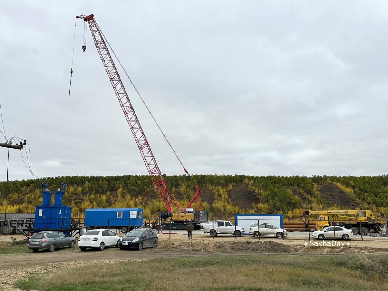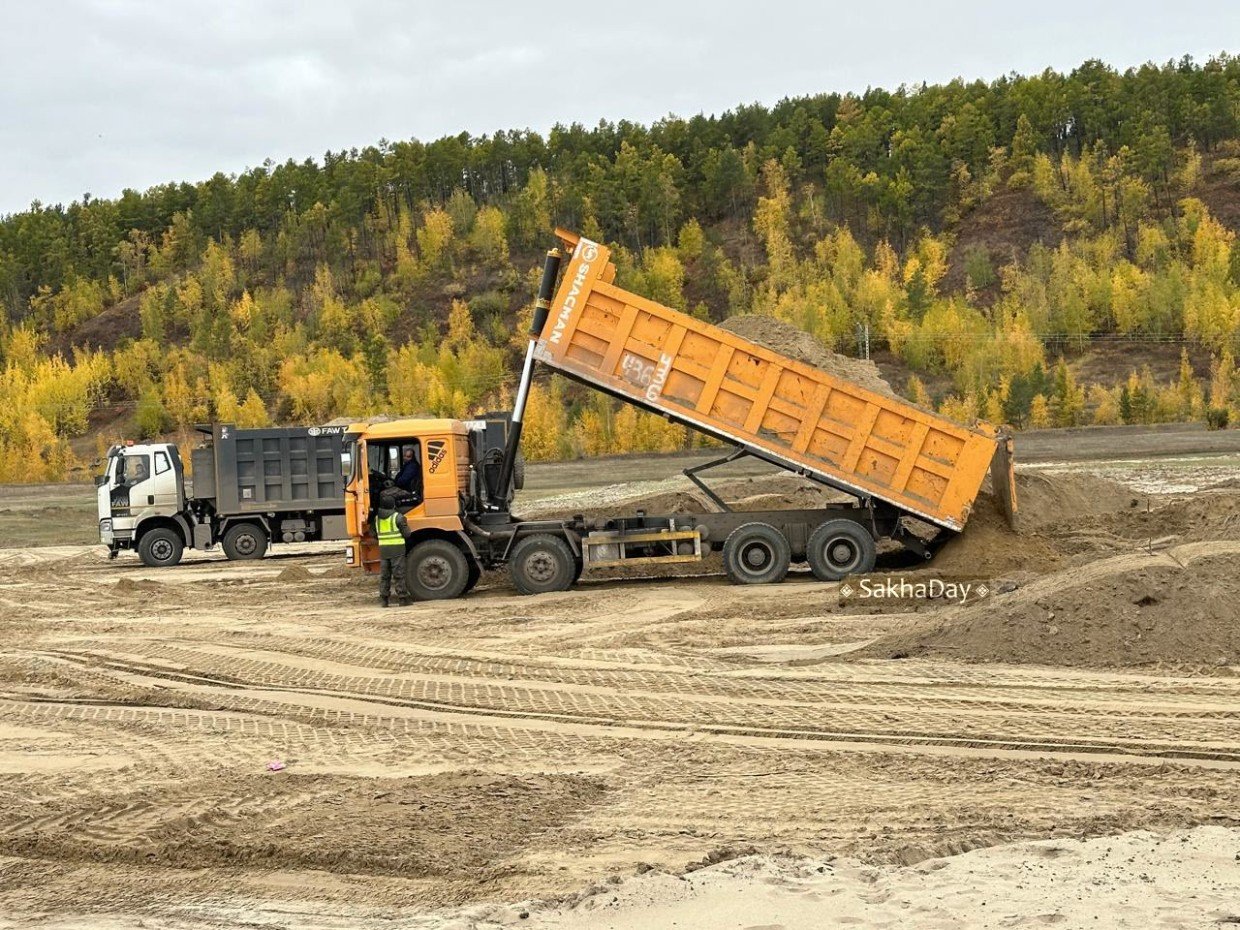 На строительной площадке Ленского моста идут интенсивные земляные работы. Многотонные самосвалы один за другим непрерывно подвозят песок. Бульдозеры разравнивают землю, а дорожные катки укатывают грунт. Смонтирован подъемный кран на гусеничном ходу.