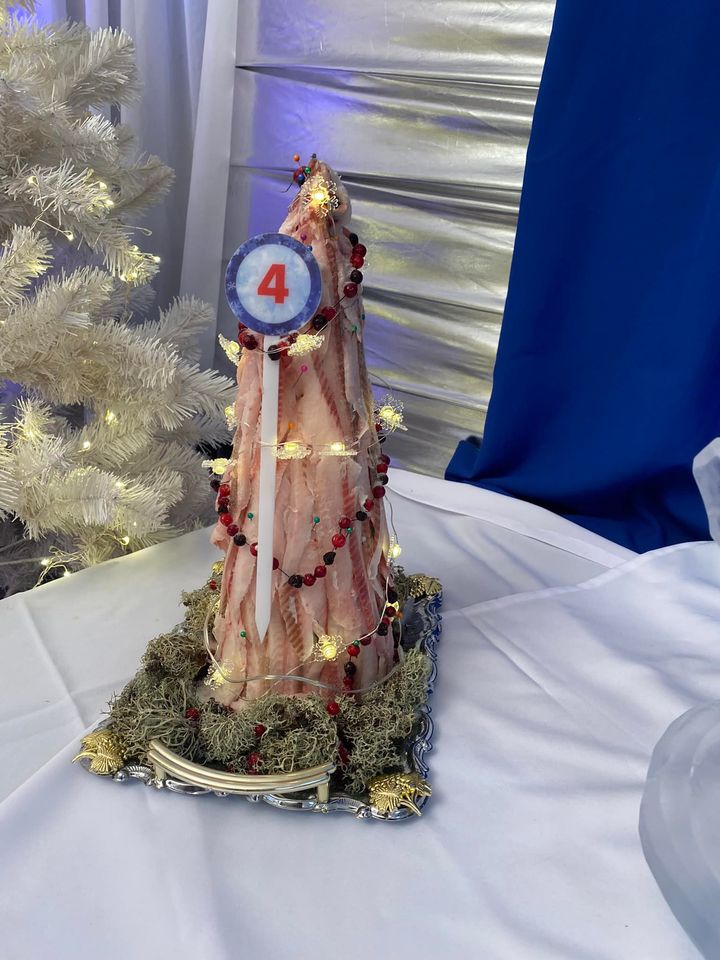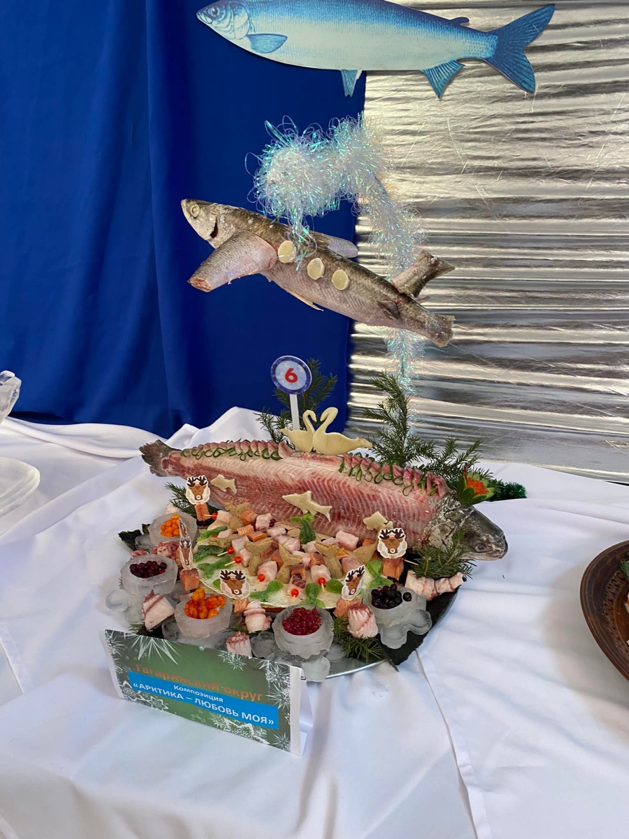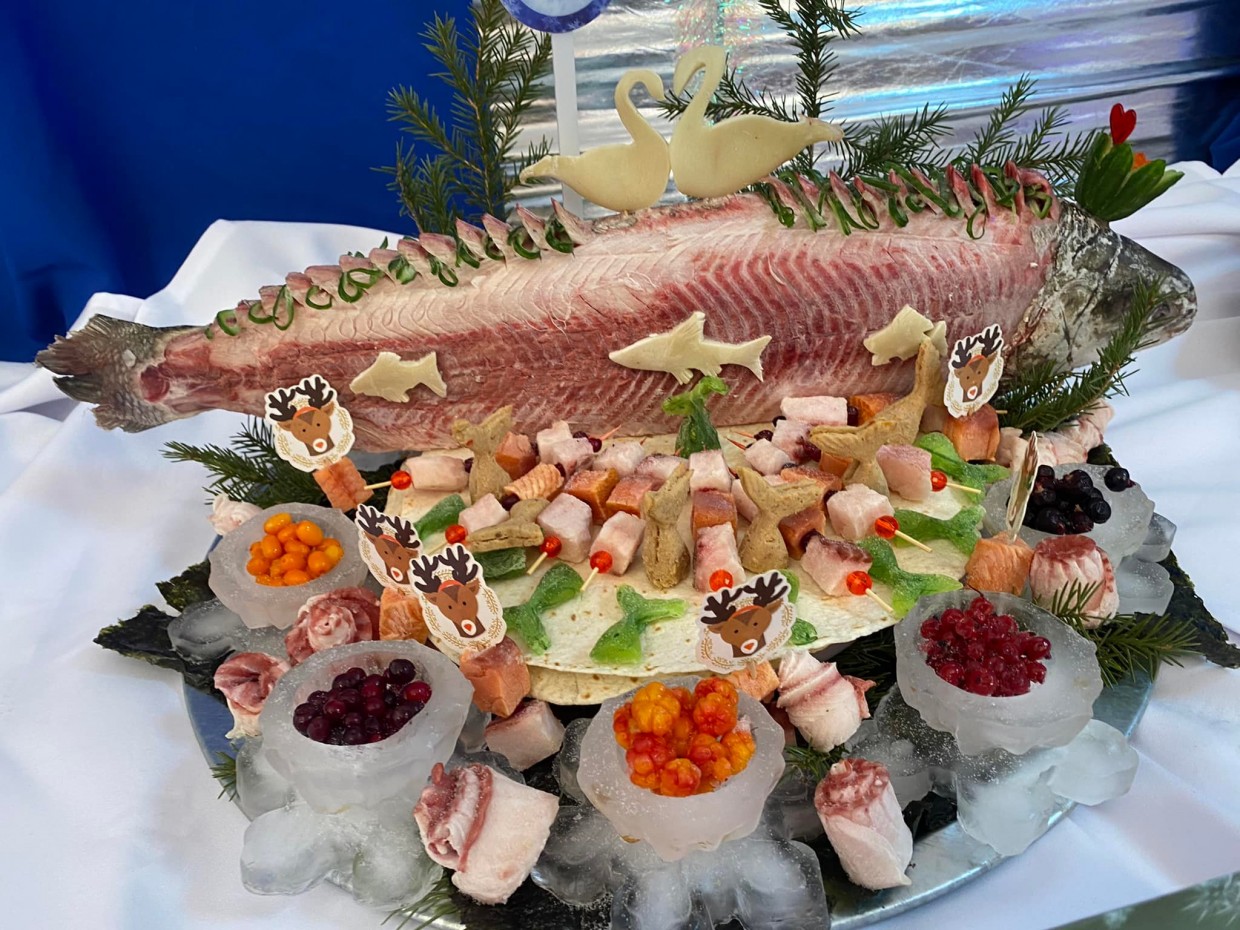 Повара, участвовавшие в конкурсе, сделали из строганины картины, карты, композиции.