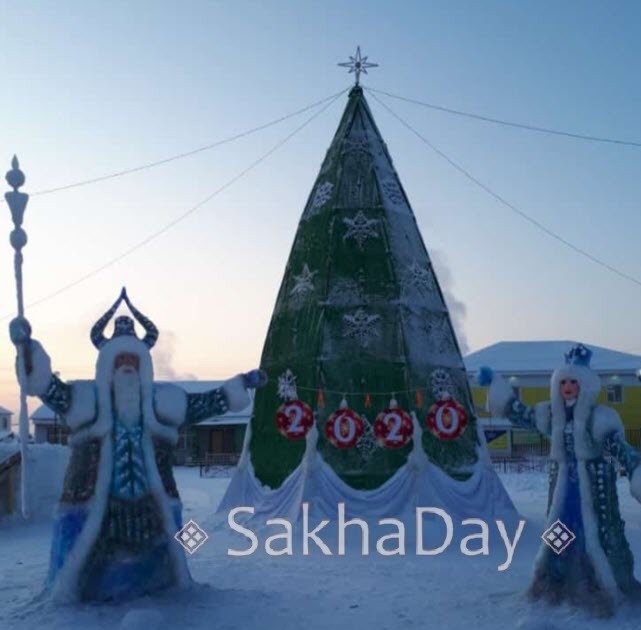 В селе Борогонцы Усть-Алданского района поставили елку, представляющую конус, обтянутый материей. Не спасли новогоднюю красавицу ни снежинки, ни стоящие рядом Дед Мороз и Снегурочка.