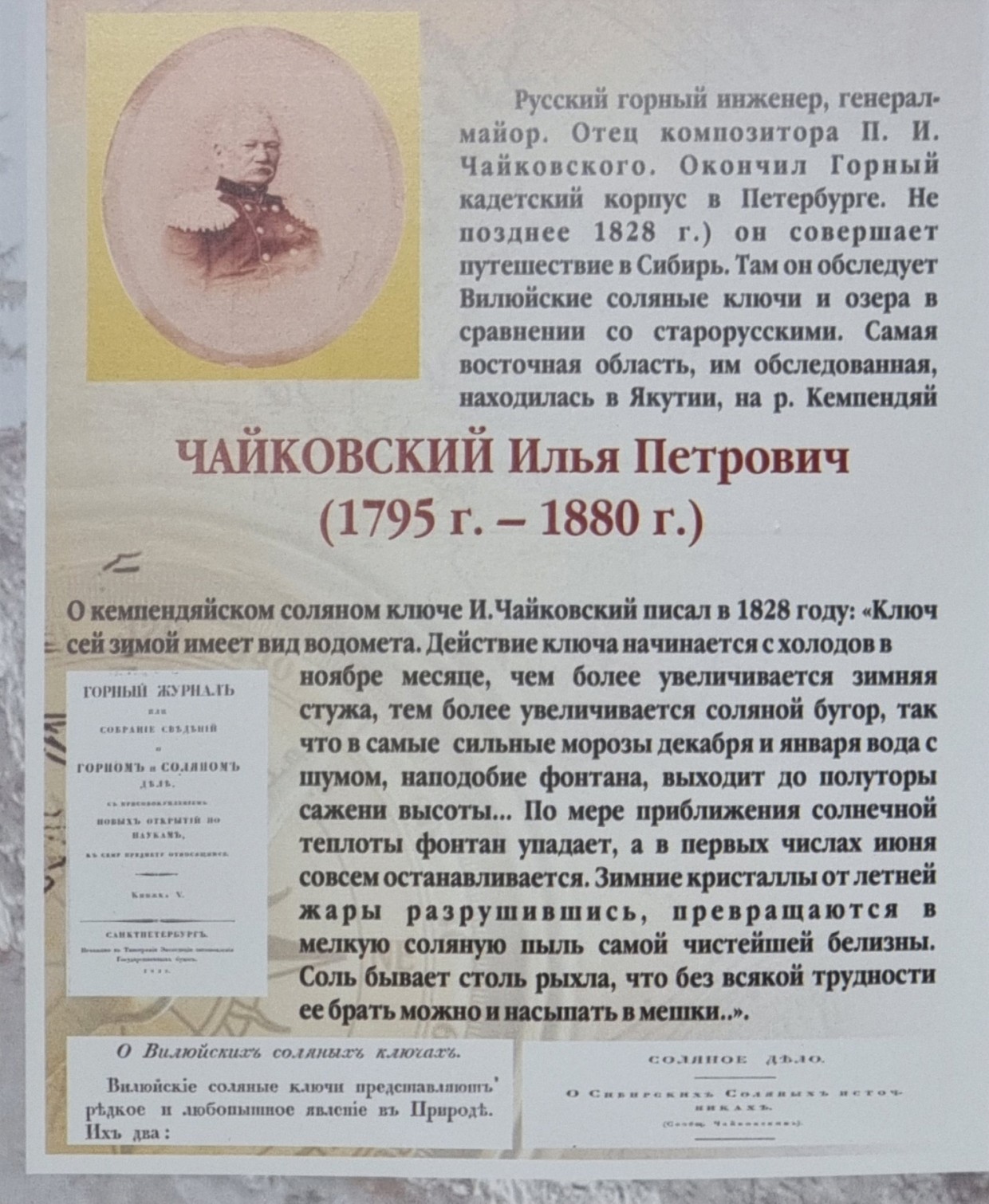 Блогер Андрей Колодезников поделился малоизвестным фактом. Как оказалось, горный инженер, генерал-майор и отец великого композитора Илья Чайковский в 1828 году совершил путешествие в Сибирь и заехал в Якутию. Там он обследовал Вилюйские соляные ключи и озера.