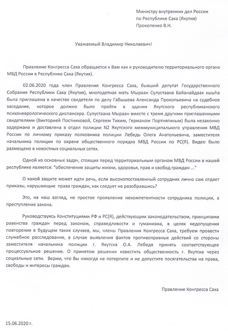 Правление Саха Конгресса требует провести служебное расследование, и в случае выявления фактов противоправных действий со стороны замначальника полиции по охране общественного порядка МВД России по РС(Я) принять соответствующее решение.