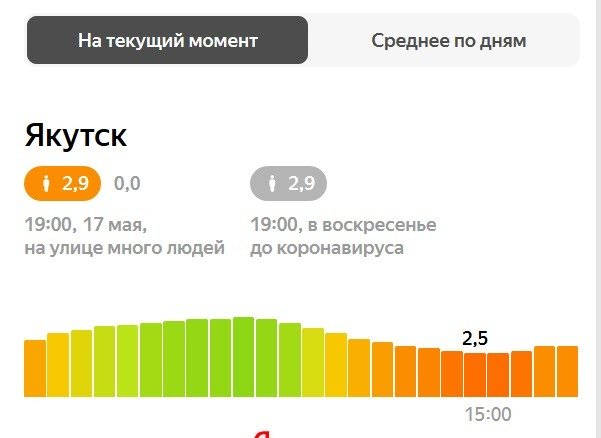 С наступлением летнего тепла в Якутске наблюдается небывалый всплеск активности на улице, сообщает Sakhaday. В этот воскресный день индекс самоизоляции в Якутске впервые показал низкий уровень - 2,5.