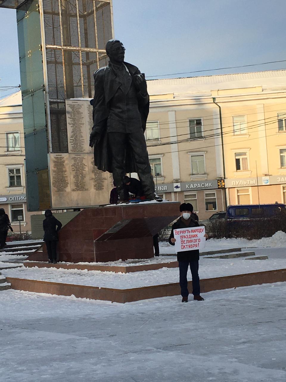 Одиночные пикеты в честь 103-ей годовщины Великого Октября проведены в Якутске на трех площадях: Ленина, Орджоникидзе, Победы.