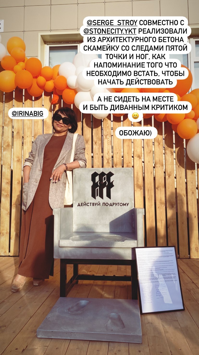 "Вчера была презентация суперкреативного изделия - кресла из бетона. Это кресло несет смысл, как символ человека, который встал и начал действовать. Идея принадлежит основательнице клуба предпринимателей Анне Кривошапкиной. Вначале думали, что не успеем. Все создавалось в крайне сжатые сроки. Но вышло классно, заказчику очень понравилось", - рассказала представительница компании, выполнившей заказ.