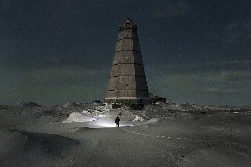 На маяке 63-летнего Славы, бывшего моряка, Евгения гостила две с половиной недели, фотографируя обстановку и человека, который провел в ней 13 лет, измеряя температуру, уровень осадков и направление ветра. «Была зима, практически постоянная темнота. Я искала образ, который сможет передать ощущение полярной ночи, с которым я выросла. Слава это сделал лучше всех».