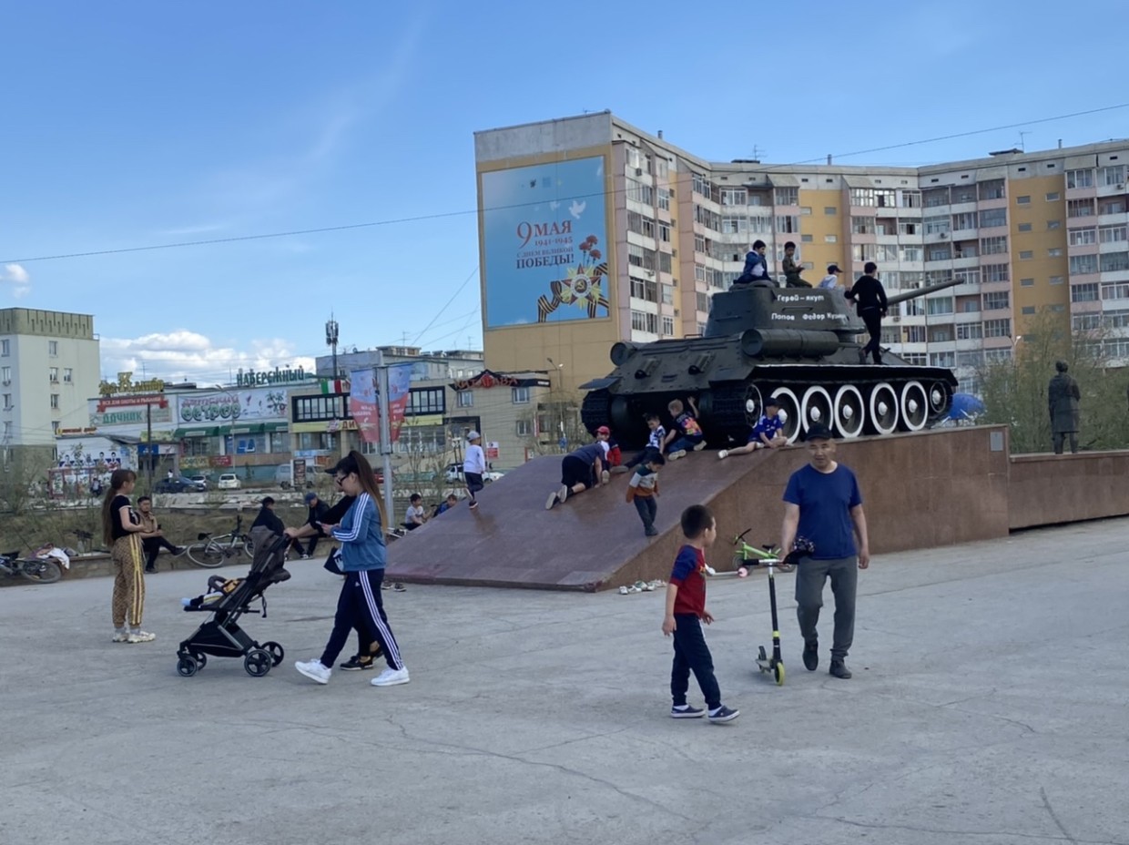 И конечно излюбленный детворой танк «Герой-якут Федор Кузьмич Попов» не остается без внимания. Мальчишки постарше залезают вверх. Малыши скатываются вниз по гладкой гранитной подставке. Пусть играют! Ведь это лучше, чем если бы памятник стоял где-то в укромном месте, всеми забытый и ненужный…