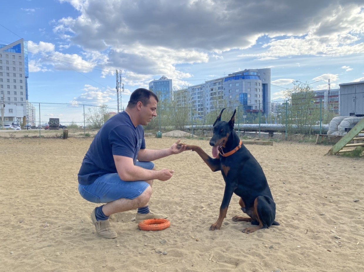 И вот мы уже на собачьей площадке 202 микрорайона. Нам еле-еле удалось уговорить добермана Гора выполнить команды на камеру. Мяса у нас не было, но этот гордый красавец все-таки вошел в положение. Гор – достаточно крупный парень, но то как двигается – просто кошачья грация!