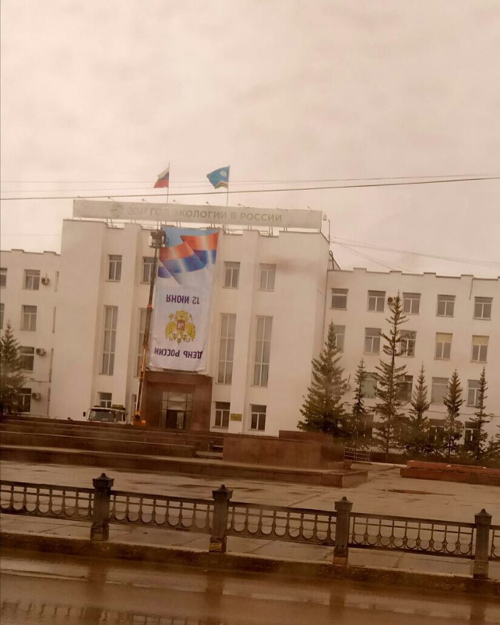 В соцсетях распространяется фотография плаката на здании Дома правительства №2 на площади Ленина. Судя по присутствию манипулятора, фотограф заснял процесс установки плаката "С Днем России!". Фото паблика "Новости Якутии".