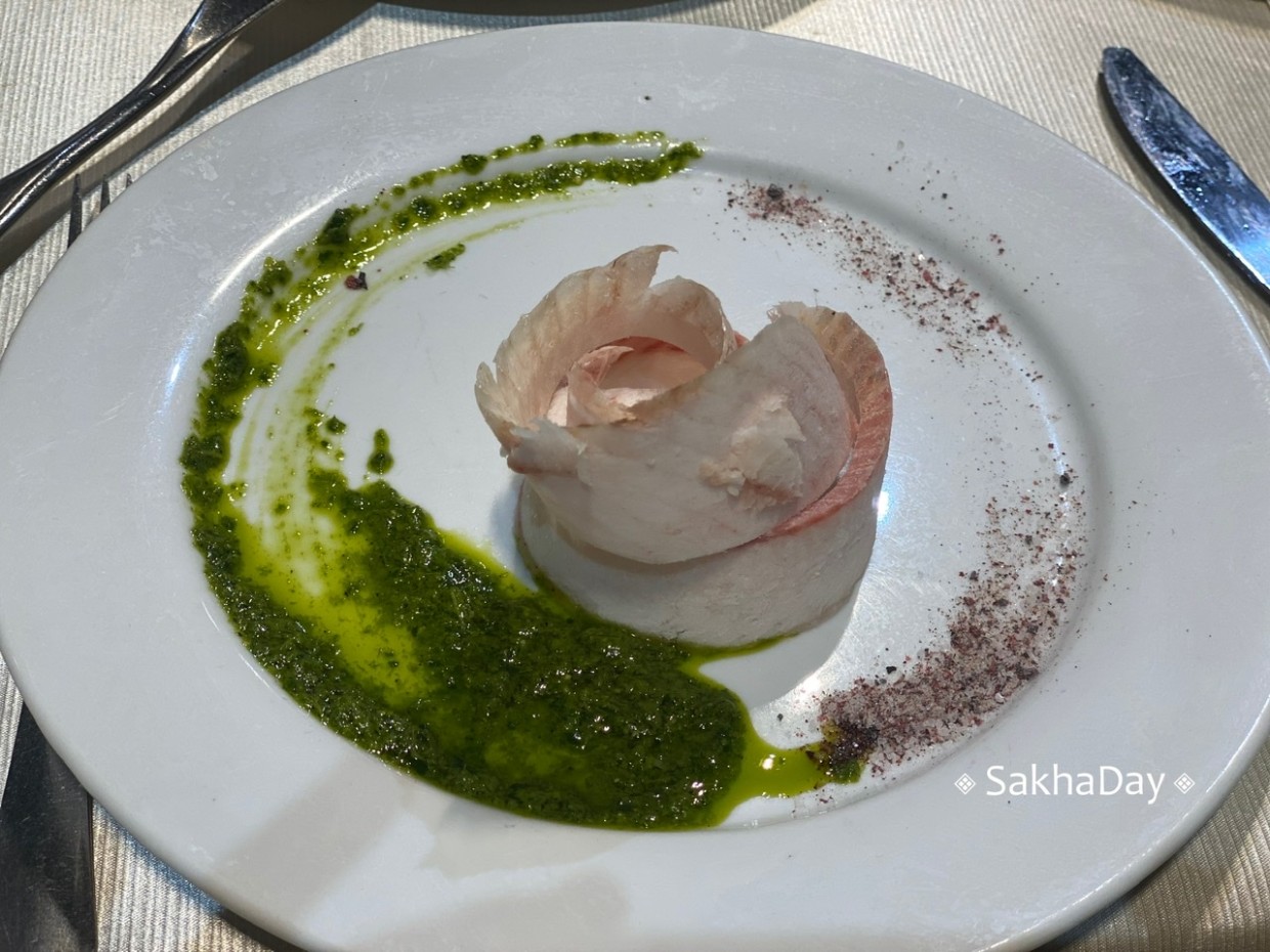 Следующим блюдом была строганина от бренд-шефа "Усадьбы Атласовых" Николая Атласова. Блюдо было подано со стопкой водки, кемпендяйской солью и... соусом из местных трав, представляете? Причем представитель ресторана сказала, что это обычные перемолотые растения, которые растут в каждом дворе. Благодаря сладковато-горькому соусу чир заиграл по-новому. Его можно сравнить отдаленно с вареньем из кислицы.